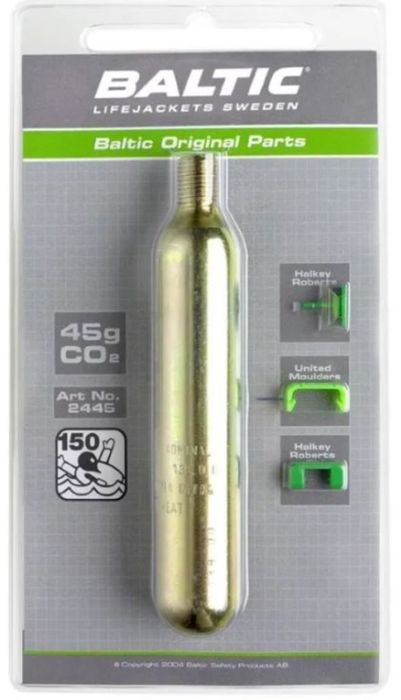 Re - Arm kit suitable for most popular makes of inflatable lifejackets. Comes complete with clips to prevent accidental activation. 33g Cylinder